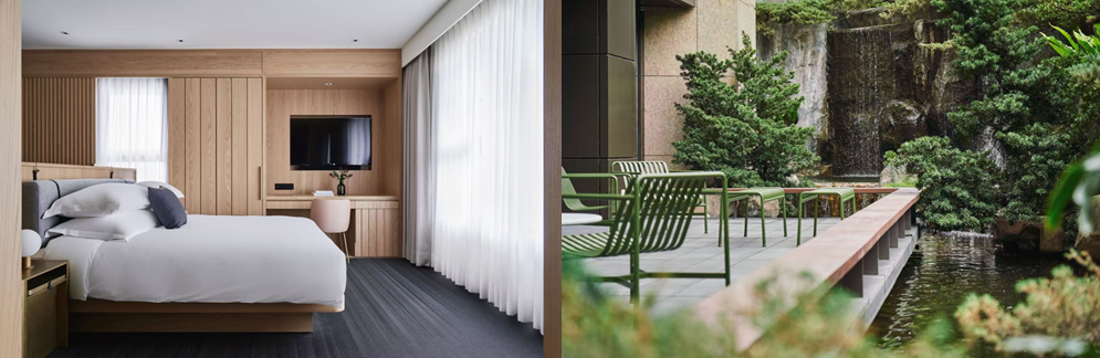 台北金普顿大安酒店为金普顿品牌亚洲首店,位于台北东区静谧街巷,与购物中心和捷运站仅隔一街,周边遍布文艺画廊、精品店与人文咖啡馆,虽邻喧嚣却宛如都市静谧方舟。129间客房与套房融合复古与白瓷层叠美学,与透光天井相呼应,处处彰显设计巧思。12楼摩登餐酒馆The Tavernist为米其林指南推荐餐厅,宽敞露台可俯瞰台北城景与台北101。酒店设施完善,包括24小时健身房及每日“社交时光”,宾客可尽享设计感与都市雅致。