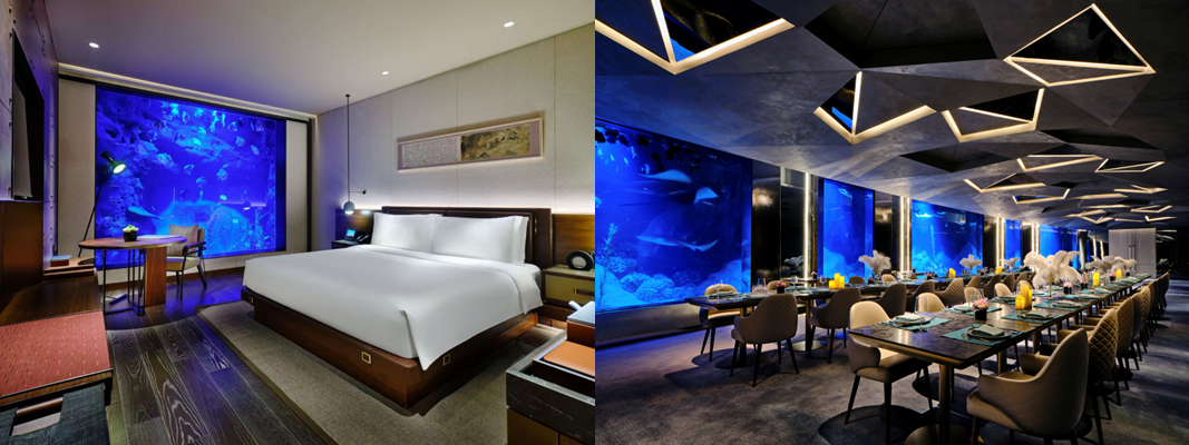 上海佘山世茂洲际酒店,地平线下88米的“建筑奇迹”,由世界知名设计师Martin Jochman团队打造,将自然岩壁与现代设计完美融合。酒店330间客房与套房各具特色,包括岩壁景观房与水下套房,带来沉浸式住宿体验。餐饮涵盖现代感十足的“源咖啡”全日餐厅、绮丽独特的彩丰楼中餐厅以及四周环绕水族馆的“渔火”特色餐厅;酒吧与大堂吧将深坑景观与自然美景相映成趣,让宾客在自然奇境中享受别具一格的入住体验。