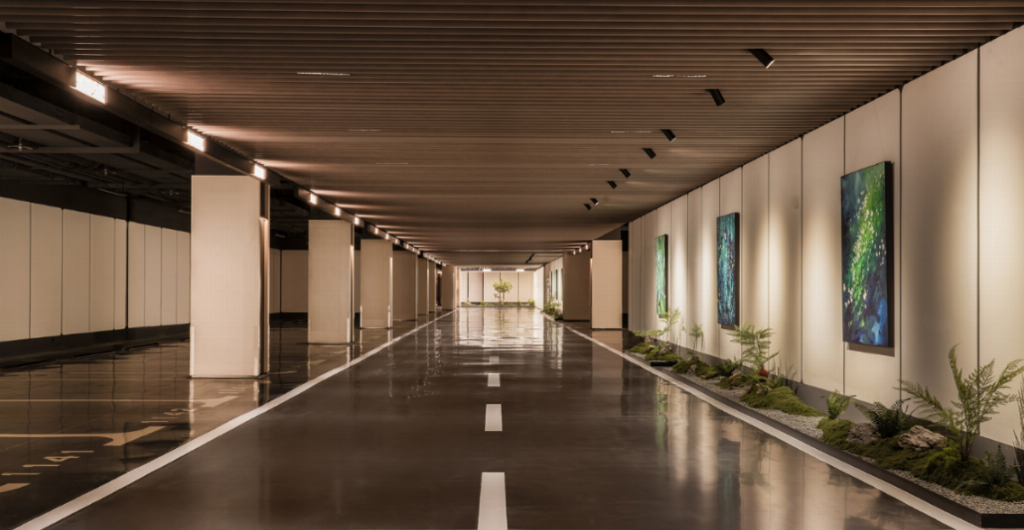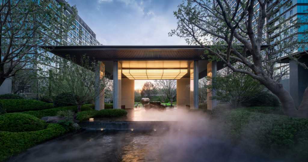 项目建筑以现代简约风格为基调,将大面积超白玻与暖色石材、金属结构相结合,在不同光照条件下折射出富有韵律的光影变化。更为引人注目的是对社区空间的整体营造:从以贝母艺术穹顶为亮点的社区大堂,经由精心设计的景观廊道,延伸至镜面水景与开阔草坪构成的核心园林。地下车库更是以高奢酒店环境为设计标准,营造出尊贵的归家礼序与隐逸体验。