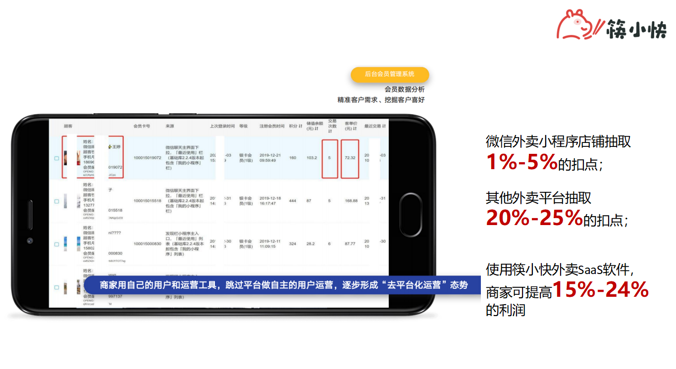 简单来说,餐饮商家可以自己运营获取的流量,不再依附于外卖平台。而不懂运营的商家还可以选择代运营服务。至于商家关心的佣金,微信外卖小程序店铺抽取比例大约1%-5%之间,相较于大平台20%-25%的比例来说,接入筷小快外卖SaaS系统,餐饮商家可提高至少15%的利润。